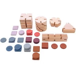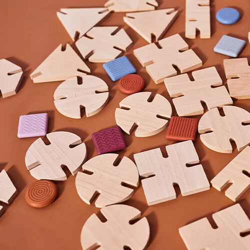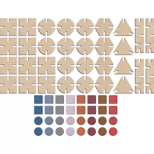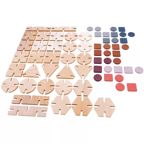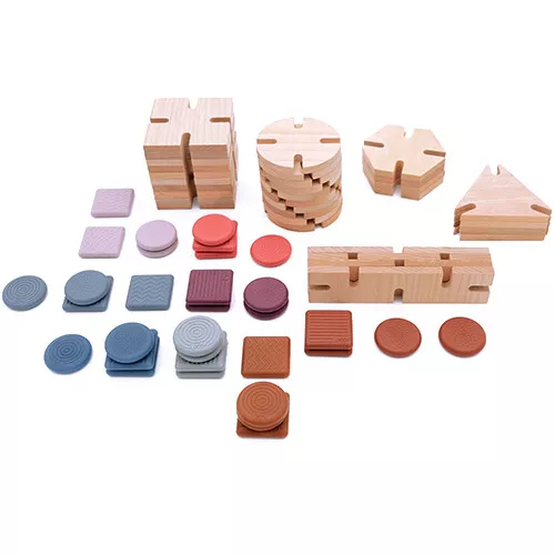 De duurzame kinderspeelgoedset bestaat uit 64 bouwstenen; 32 geometrische, houten basiselementen en 32 sensorische, siliconen verbindingselementen. De houten en siliconen elementen zijn dankzij de inkepingen eenvoudig met elkaar te verbinden.
