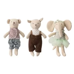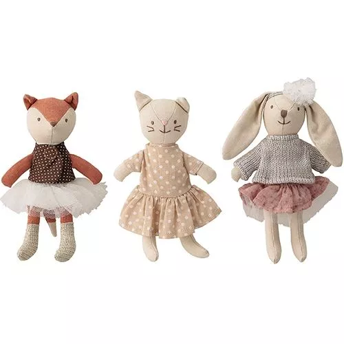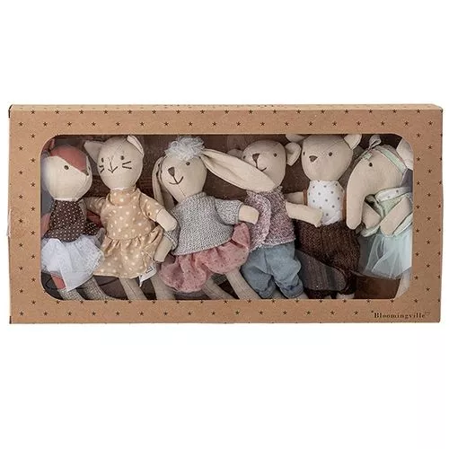 Zes onweerstaanbare knuffeldieren van het Deense merk Bloomingville. De beestenboel bestaande uit een vos, poes, konijn, beer, hond en olifant dragen allen hun lievelingskleding.
