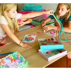 Met dit creatieve setje kunnen kinderen vier kaarten versieren met de filigraan papierstroken. Inclusief handig eenhoorntje waarmee het papier kan worden gedraaid.