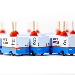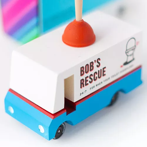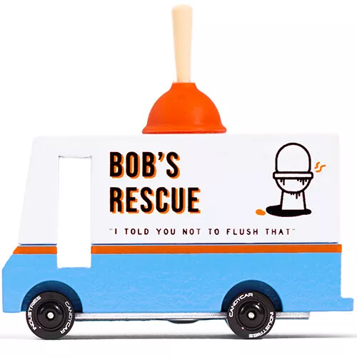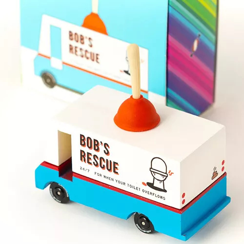 Ongelukje gehad? Deze speelgoedauto ‘Bob’s Plumbing’ van het Amerikaanse merk Candylab is de redder in nood. Deze wit-blauwe bus met ontstopper op zijn dak is door zijn opvallende uiterlijk van ver af te zien, en maar goed ook, want de redding is nabij.