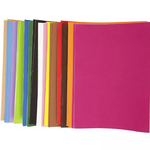 De vellen hebben 15 verschillende kleuren met van elke kleur 2 vellen. Knip of stans figuurtjes uit naar wens en plak deze met lijm op een tekening of kunstwerk.