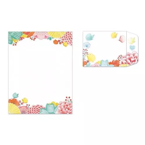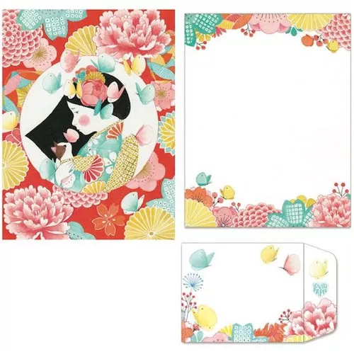 De schrijfset bestaat uit 24 versierde schrijfvellen en 12 enveloppen.