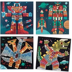 Vier indrukwekkende ruimtewezens worden rijkelijk versierd met mozaïek mousse, in deze inlegset ‘Space Battle’ van het Franse merk Djeco.