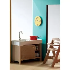 Een mooie uitgebreide keukenset van het Franse merk Djeco voor een poppenhuis. De speelgoedkeuken bestaat uit een koelkast met vriezer, een kookpit met aanrechtblad, een wasbak, pannen, kookingrediёnten, drinken en een klok.