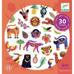 Een schitterend stickervel met exotische dieren, planten en fruit van het Franse merk Djeco. De vleugels en vachten zijn versierd met kleine strass steentjes.