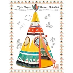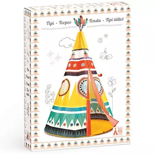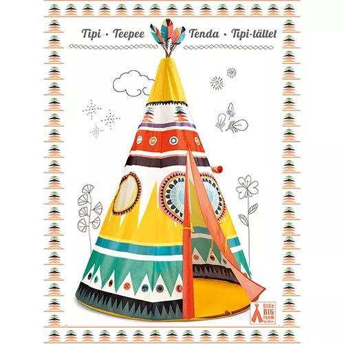 Een geweldige indianentent uit de serie Little Big Room van het merk Djeco met kleurige motieven in warme kleuren en een vrolijke verentop.