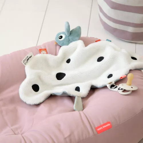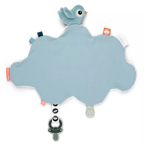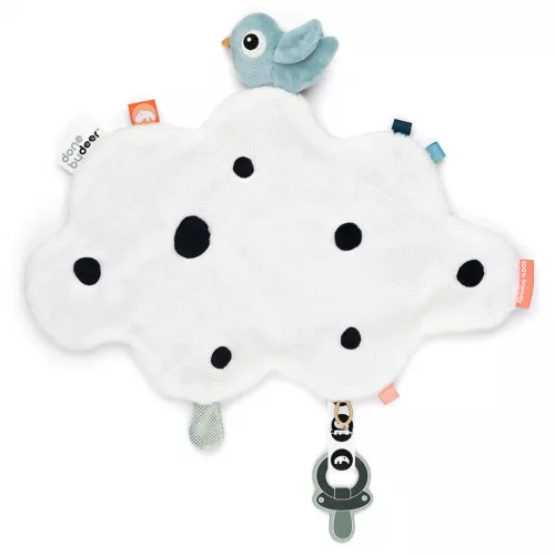 De troeteldoek met een knuffelvogeltje heeft twee zijden van verschillende stof en heeft de vorm van een wolk.