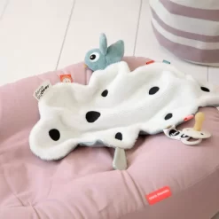 Een zijdezacht knuffeldoekje ‘Comfort Blanket Happy Clouds – Blue’ van het Deense merk Done by Deer waarmee de speen nooit ver weg is.