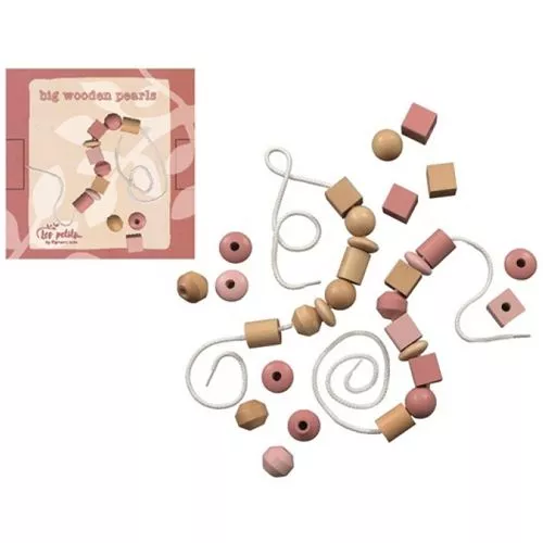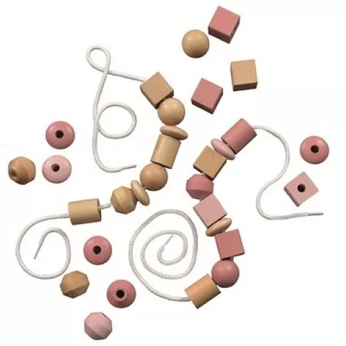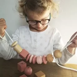 Met de grote houten rijgkralen van het Belgische merk Egmont Toys zullen kleine vingers het rijgen snel onder de knie krijgen. Voor wie wordt de mooie ketting?