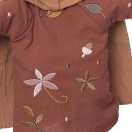 De poppenkastpop is gemaakt van katoen. Haar koninklijke gewaad is versierd met geborduurde bloemen en bladeren.