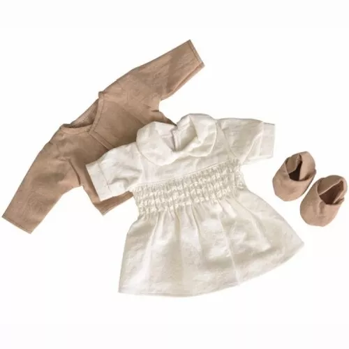 De poppenkleding bestaat uit een wit jurkje met gesmokte rand, een beige jasje en eveneens beige schoentjes.