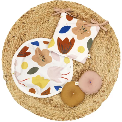 Deze decoratieset bestaat uit een jute vloerkleed, een tafelkleed en stoelkussen met een fleurige bloemenprint en twee stijlvolle sierkussens in de kleuren oker en oudroze.