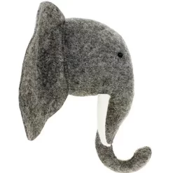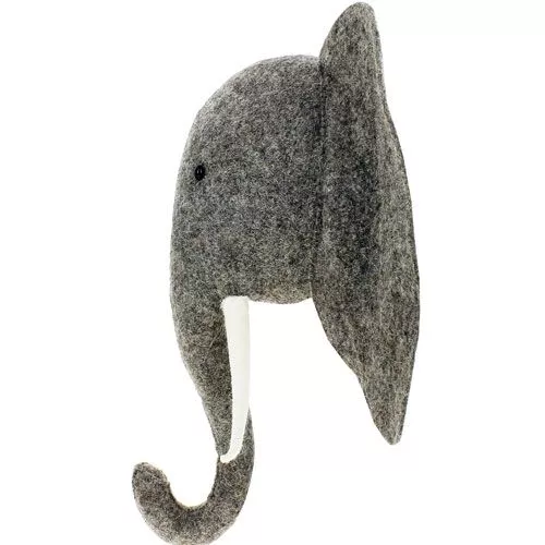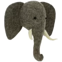 Deze vilten olifant in natuurgetrouwe kleuren heeft slagtanden, grote flaporen, een flinke slurf en kleine kraaloogjes boven op zijn kop. Met zijn imposante verschijning is hij een verrijking in de kinderkamer, speelkamer of woonkamer. De wanddecoratie is eenvoudig aan de muur te bevestigen met een haak aan de achterzijde.