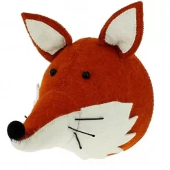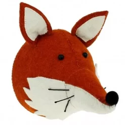 Deze vilten vossentronie in natuurgetrouwe kleuren – kastanjebruin en witte bef – heeft een spitse snuit met snuffelneus, twee gespitste oren, kraalogen en snorharen van ijzerdraad. Een aanwinst voor iedere kinderkamer, speelkamer of woonkamer. De wanddecoratie is eenvoudig aan de muur te bevestigen met een haak aan de achterzijde.