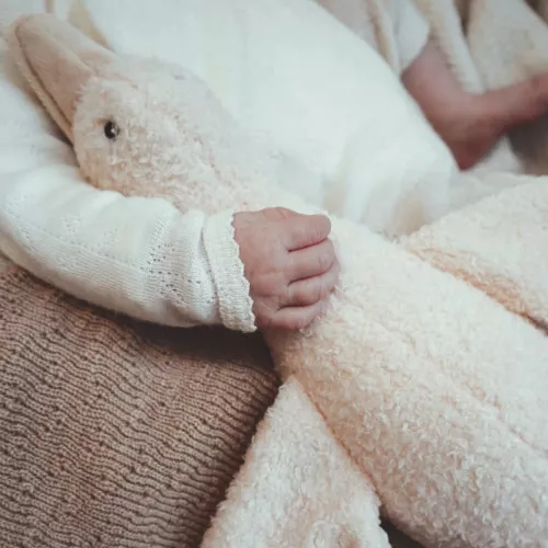 Deze gemoedelijke hartslagknuffel ‘Liva Beige – Heartbeat Comforter’ van het Nederlandse merk Flow Amsterdam sust de baby in slaap.