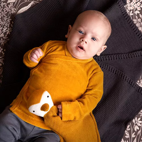 Een gebreid knuffeldoekje ‘Cuddle Cloth Pinguin’ van het Nederlandse merk Fresk om dichtbij te houden voor een knus en veilig gevoel.