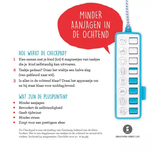 Het kind kiest maximaal acht magneetjes met taken die hij of zij zelfstandig kan uitvoeren. In één oogopslag zien kind en ouder welke taakjes nog gedaan moeten worden. En taak die nog gedaan moet worden is gekleurd. Als de taak gedaan is kan het wieltje een halve slag gedraaid worden, van gekleurd naar wit. Draai na de ochtendtaken de checkpad om en hij is klaar voor de middag of avond.
