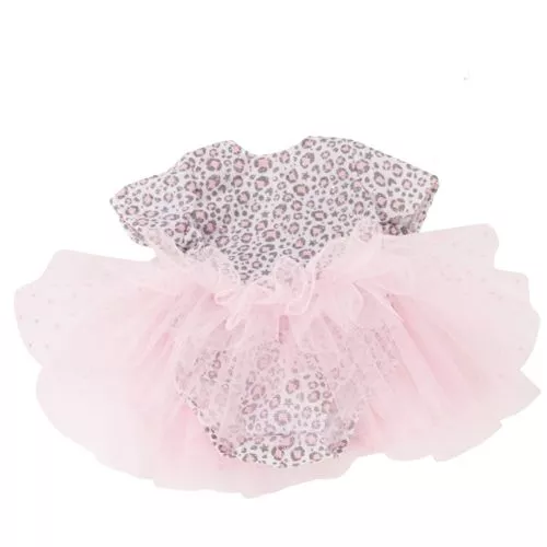 Een sierlijk balletpakje ‘Cuddly Cat’ van het Duitse merk Götz. Zo kan ook de pop op balletles. Met dit glinsterende poppenjurkje met lieflijk grijze en lichtroze luipaardprint en klassieke tuturok is de eerste stap gezet.