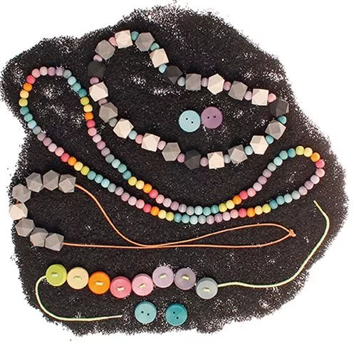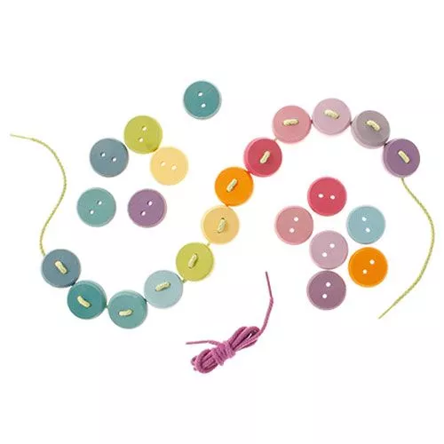 De rijgknopen met een diameter van 3 cm, zijn groot genoeg voor kleine vingertjes. Met de veterkoorden een precisie werkje en goed voor de fijne motoriek.