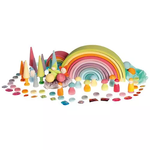 Met de zachte regenboogkleuren wordt het een mooie, kleurige ketting of armband met dit ‘Fädelspiel kleine Holzknöpfe’ van het Duitse merk Grimm’s. Ook verspreid als onderdeel van een tafreeltje zijn de speelgoedknopen decoratief.