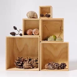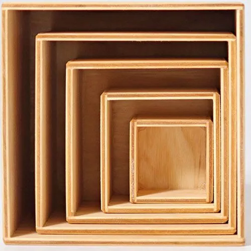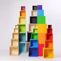 Deze kubusset van het Duitse merk Grimm’s bestaat uit 5 boxen. Kleine peuters kunnen er een stapeltoren mee bouwen, om de toren vervolgens omver te gooien! Altijd pret. Een precies werkje met veel passen en meten.Veelzijdig speelgoed, om een huisje van te maken of een garage. Of worden er schatten in bewaard?
