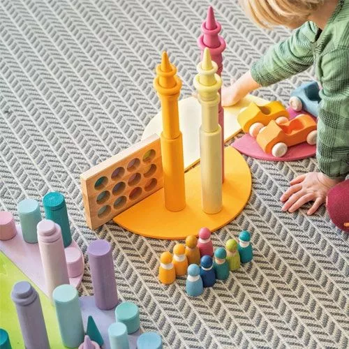 Veelzijdige constructie rollers. Deze houten speelgoedstaven van het Duitse merk Grimm’s zijn multi inzetbaar. Als pilaren bij het bouwen van huizen en kastelen of het stapelen van torens.
