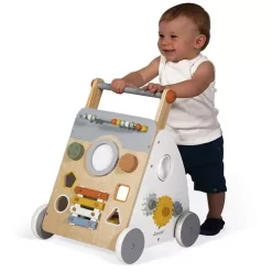 Een vrolijke multi-activiteitentrolley ‘Sweet Cocoon’ van het Franse merk Janod voor het oefenen van de eerste stapjes. Dit verrijdbare houten speelgoedwagentje heeft 9 ingebouwde speeltjes. Hiermee kan de kleine tijdens de ontdekkingstocht door de kamer zich ook nog eens te entertainen, als de beentjes moe worden.