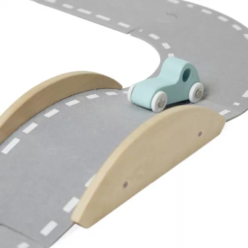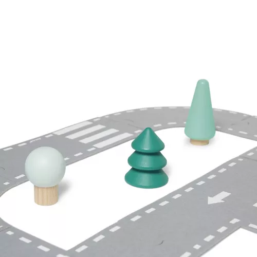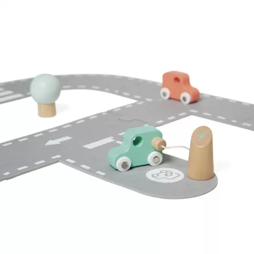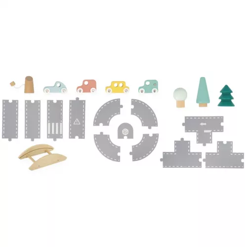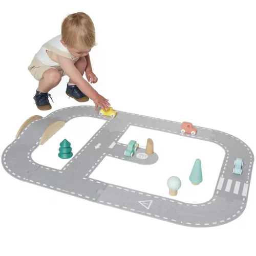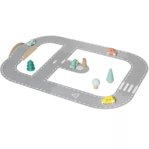 De autobaan bestaat uit twaalf vilten wegstukken die gemakkelijk aan elkaar te schakelen zijn. Met bijgeleverde houten auto’s, bomen en een laadpaal met magneet kan er meteen van start gegaan worden.