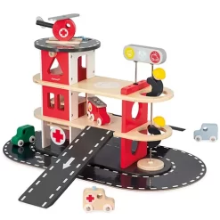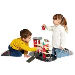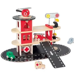 Ontdek de wereld van de brandweer en wees een held door de stad te redden! Deze prachtige houten brandweerkazerne van het Franse merk Janod heeft drie etages en is voorzien van een handmatige lift en een landingsplatform voor de helikopter op het dak.