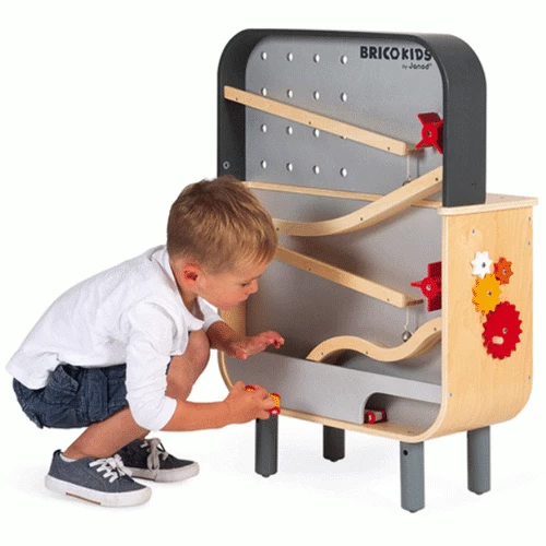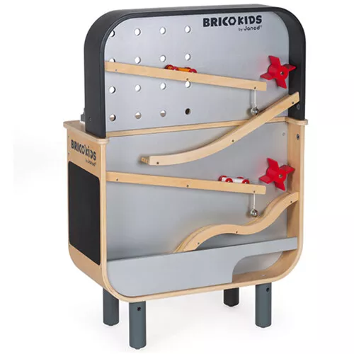 Een houten speelgoedwerkbank om aan twee zijden mee te spelen van het Franse merk Janod. Aan de voorzijde is het een magnetische kinderwerkbank en aan de achterzijde een afdaling met vier banen om auto’s naar beneden te laten racen. Speelgoed voor de echte klusser én racer.