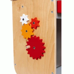 De autobaan aan de achterzijde is voorzien van twee speelgoedauto’s en verschillende obstakels zoals wieltjes en belletjes die getrotseerd moeten worden om de finish te halen.