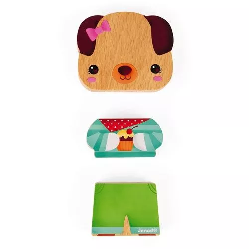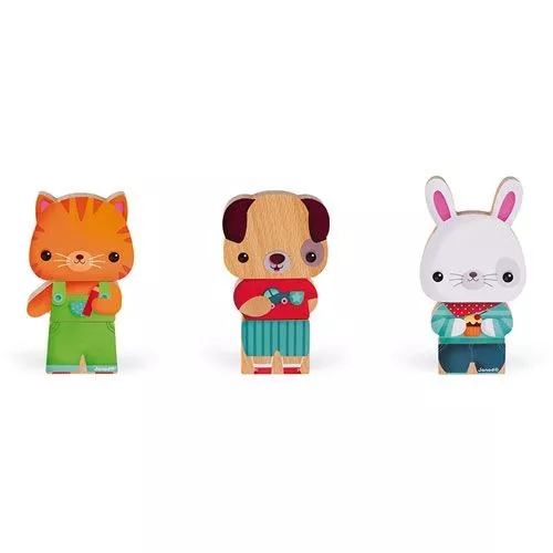 Een set met houten magneten ‘Funny magnets – huisdieren’ van het Franse merk Janod, bestaande uit een kat, konijn en hond. Ieder diertje bestaat uit drie magnetische delen en zijn dubbelzijdig. Haal ze los, mix ze creatief of voeg ze samen zoals ze horen: een leuk combinatie- en verbeeldingsspel!
