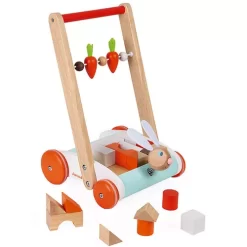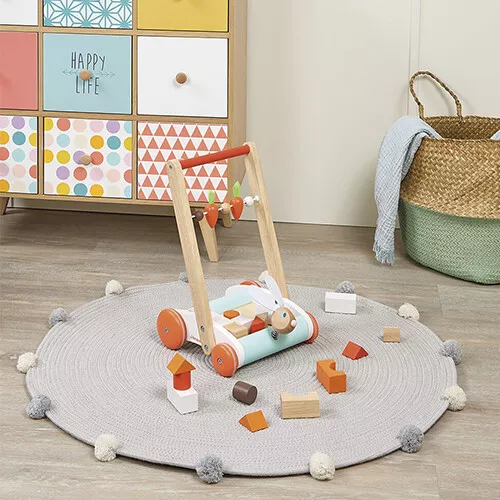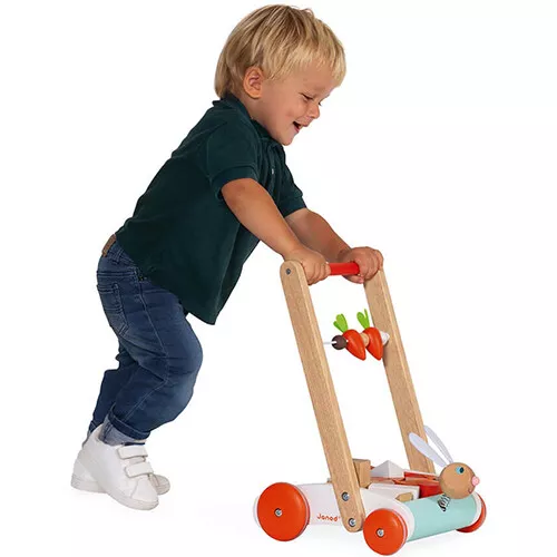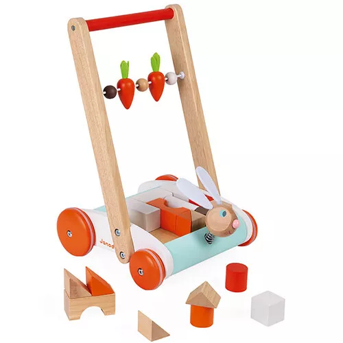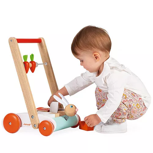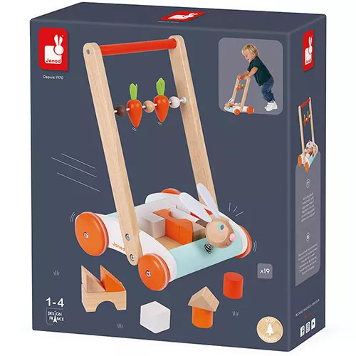 Een stabiele loopwagen met blokken ‘Rabbit Push Along Trolley’ van het Franse merk Janod om de eerste stapjes mee te oefenen.