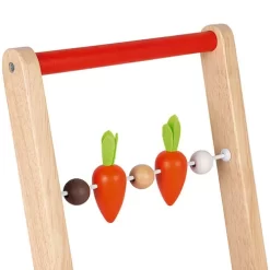 De duwstang is voorzien van een telraam met drie kralen en twee worteltjes en aan de voorkant van de blokkenwagen bevindt zich een konijntje, bevestigd op een springveer, dat beweegt tijdens het rijden.