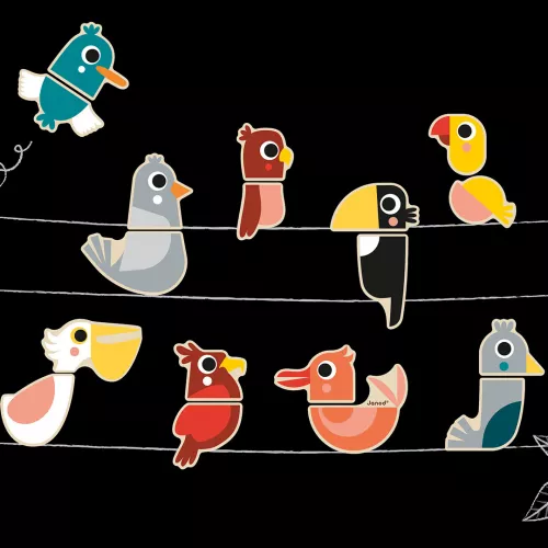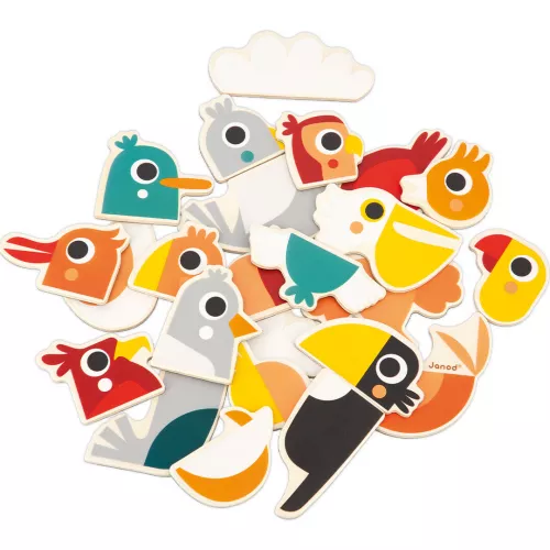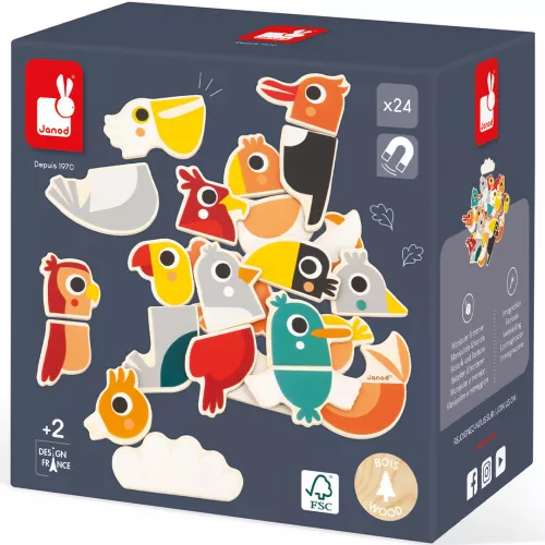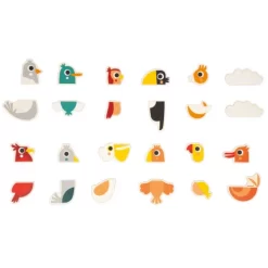 Een papegaai, pelikaan of een peligaai? Leer verschillende vogels kennen en bedenk zelf creatieve vogelcombinaties met deze set van 24 houten magneten ‘Birds’ van het Franse merk Janod.