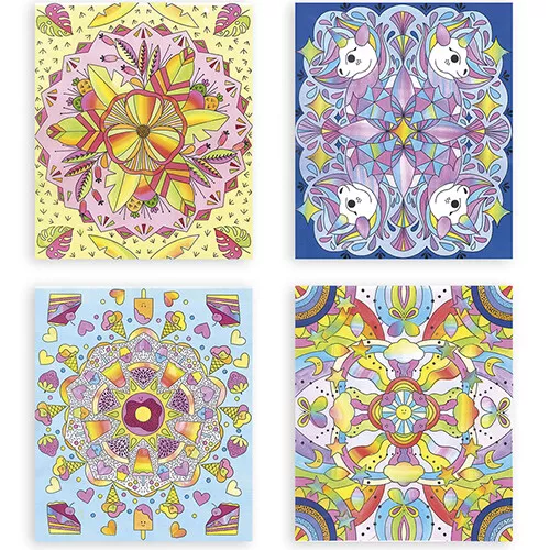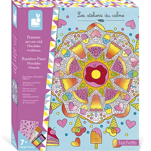 Met aquarelverf, een penseel en een innovatieve techniek maken beginnende kunstenaars betoverende regenboogschilderijen. De verfset uit de ‘Les Ateliers Du Calme’ collectie van het Franse merk Janod bevat vier mandala’s, die met behulp van sjablonen ingekleurd kunnen worden. Met de brede kwast kunnen wel vier kleuren tegelijk aangebracht worden. Het kleurverloop dat ontstaat geeft de mandala’s een bijzonder effect.
