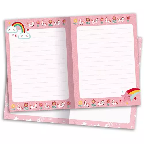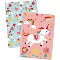 Twee handzame gelinieerde notitieboekjes van het Franse merk Janod vergulde effecten op de kaften. De schriftjes zijn versierd met eenhoorns, regenbogen en andere vrolijke illustratie. Ook de pagina’s zijn voorzien van illustraties.