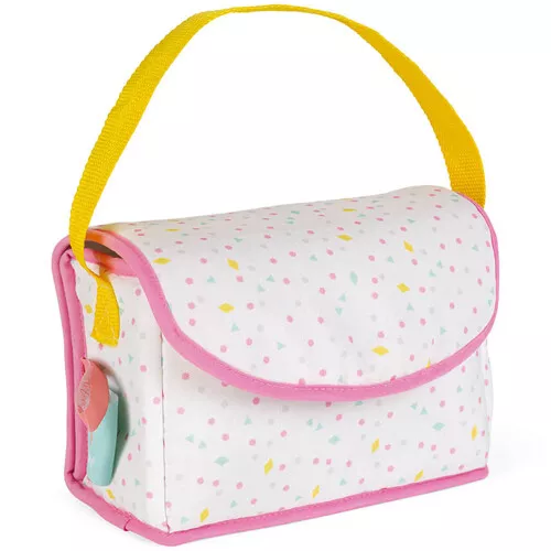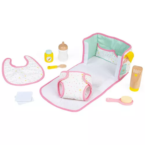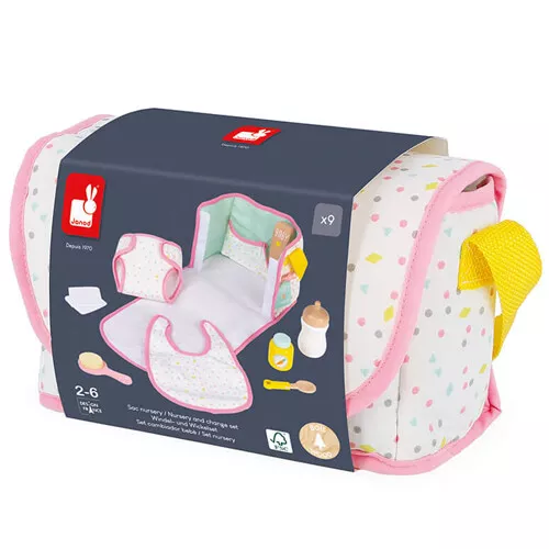 Een complete poppenverzorgingsset van het Franse merk Janod voor babypoppen van 36 tot 42 cm. Zo kunnen poppenmoeder op elk moment de pop voeden en verzorgen, zowel thuis als onderweg.