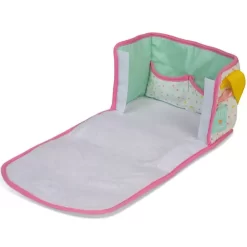 De verzorgingstas heeft meerdere vakken aan zowel de binnenkant als buitenkant. Vouw de tas open en tover hem om tot verschoonmatje om poppenluiers te verschonen. Het matje is bekleed met badstof.