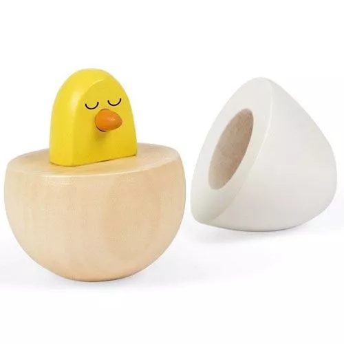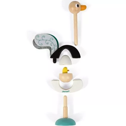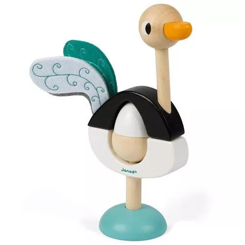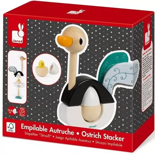 Een vrolijke houten en wolvilten stapeltoren van het Franse merk Janod. Veilig genesteld in de buik van de struisvogel zit een kuikentje verstopt in het ei.