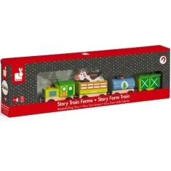Een vrolijke boerderijtrein ‘Story Farm Train’ van het Franse merk Janod met magneetbuffers.
