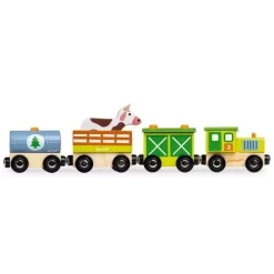 Een vrolijke boerderijtrein ‘Story Farm Train’ van het Franse merk Janod met magneetbuffers.