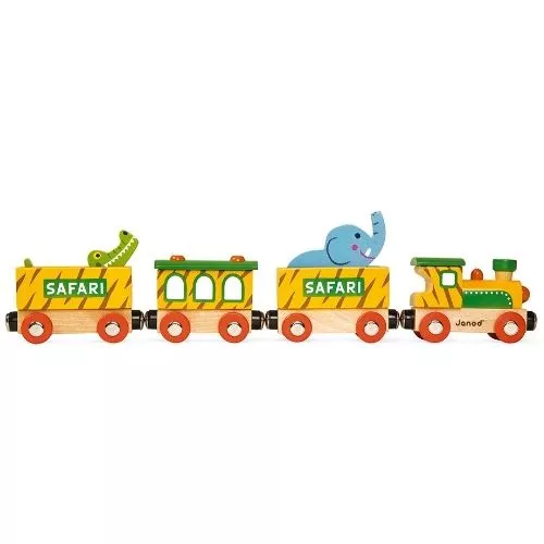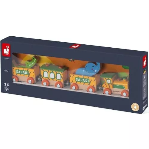 Een vrolijke safaritrein ‘Story Safari Train’ van het Franse merk Janod met magneetbuffers.