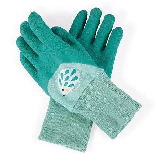 De handschoenen hebben een groene kleur en een stevige, beschermende onderlaag met goede grip. Op de hand staat een vriendelijke egel.