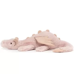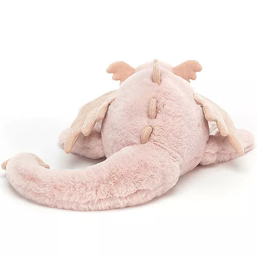 Deze sprankelende mythische knuffeldraak ‘Rose Dragon’ van het Engelse merk Jellycat weet de aandacht te trekken. De knuffelige draak heeft een fluweelzachte, roze vacht en zijn oren, stekels, vleugels en staartpunt hebben een rosé-gouden glans.