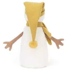 Met zijn gele muts en sjaal is hij een echte decoratieve eyecatcher in huis. De sneeuwpop heeft geborduurde knopen op zijn buik, armen van corduroy en een speelse glimlach.
