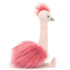 Deze kleine, flamboyante knuffelvogel ‘Fou Fou Ostrich’ van het Engelse merk Jellycat steelt de show met haar zuurstokroze vacht en pluizig verenkleed.