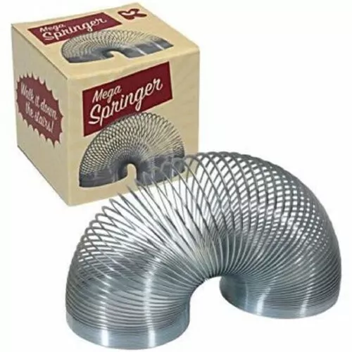 Laat hem gerust traplopen, deze metalen ‘Mega Springer’ van het Engelse merk Keycraft. Hij heeft alleen een klein zetje nodig, als je hem boven aan de traptree plaatst.