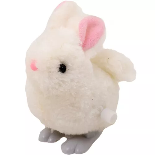 Draai aan het wieltje om het speelgoedkonijntje op te winden en kijk hoe hij vrolijk over de tafel hupt.
