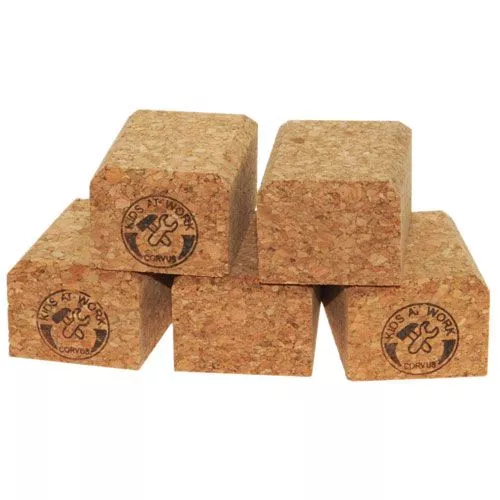 Vijf schuurblokken vam kurk met grof en fijn schuurpapier uit de serie Kids-at-Work van het Duitse speelgoedmerk Corvus.